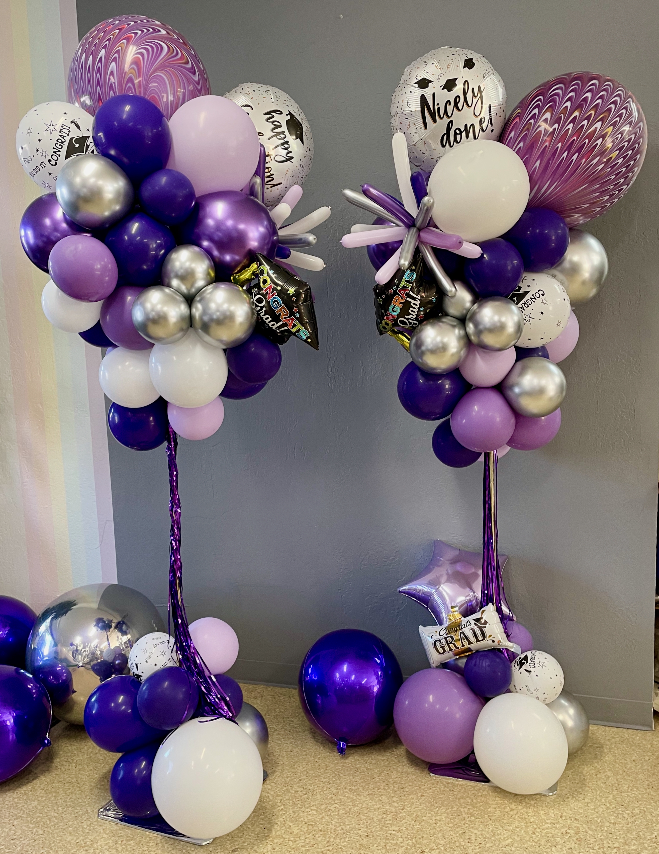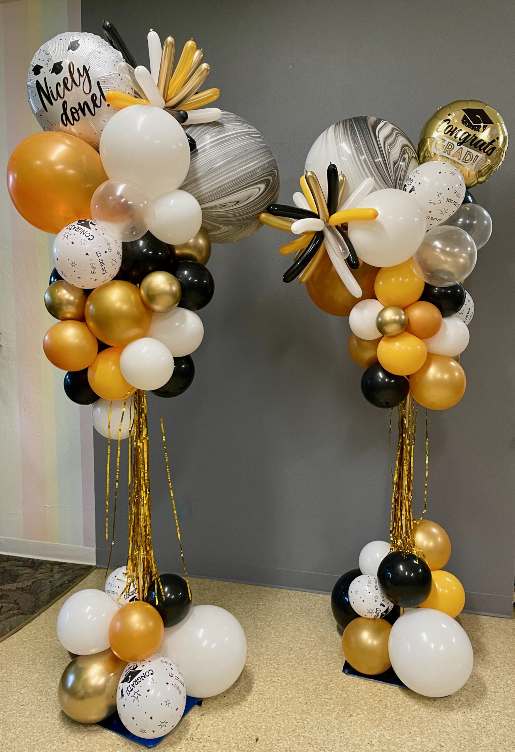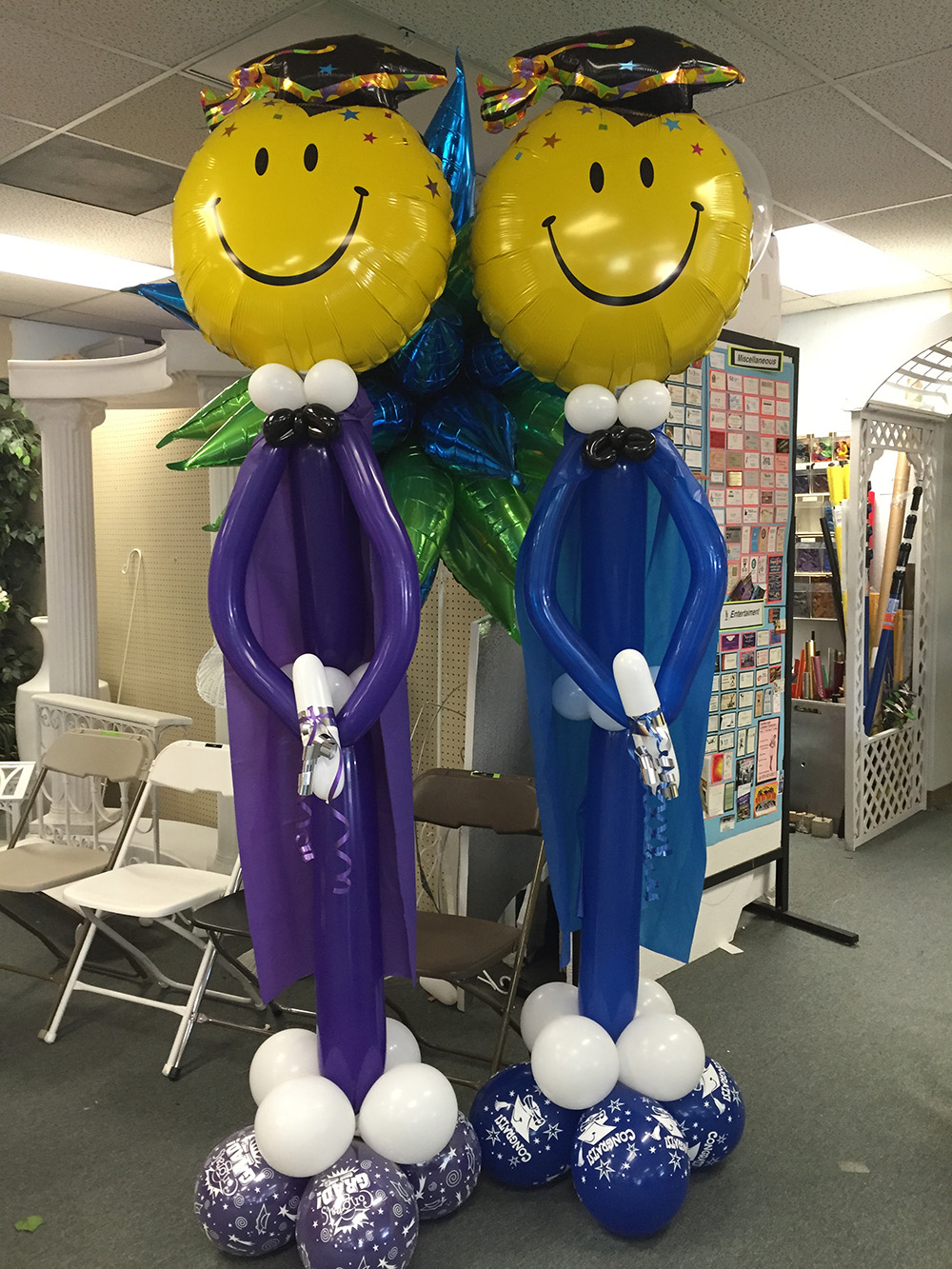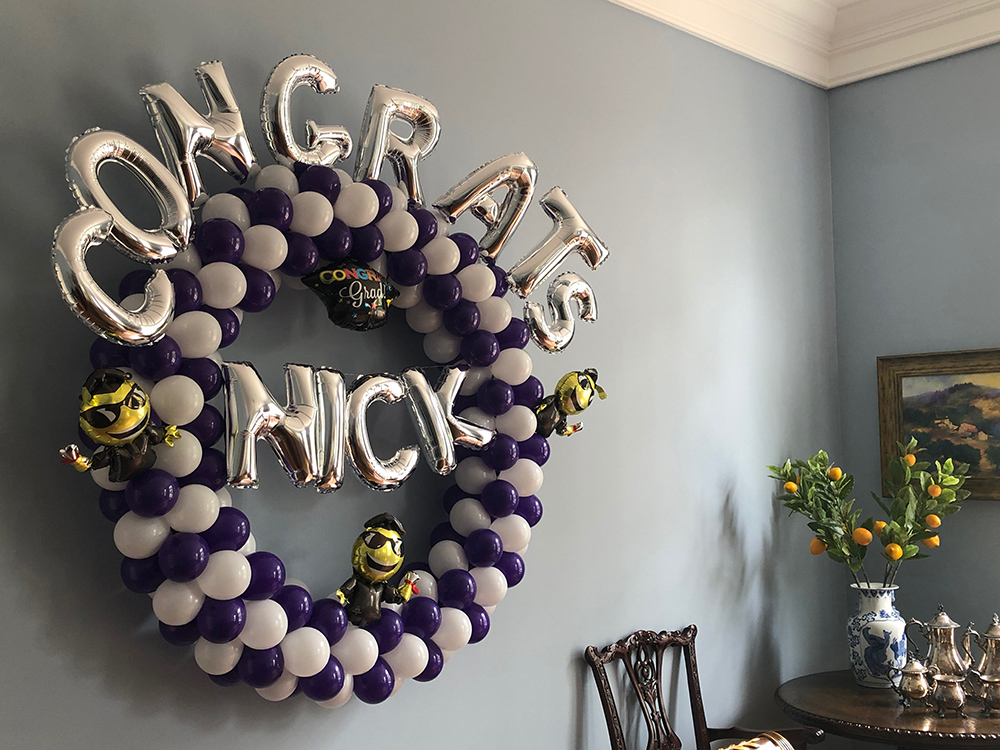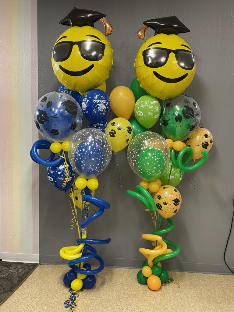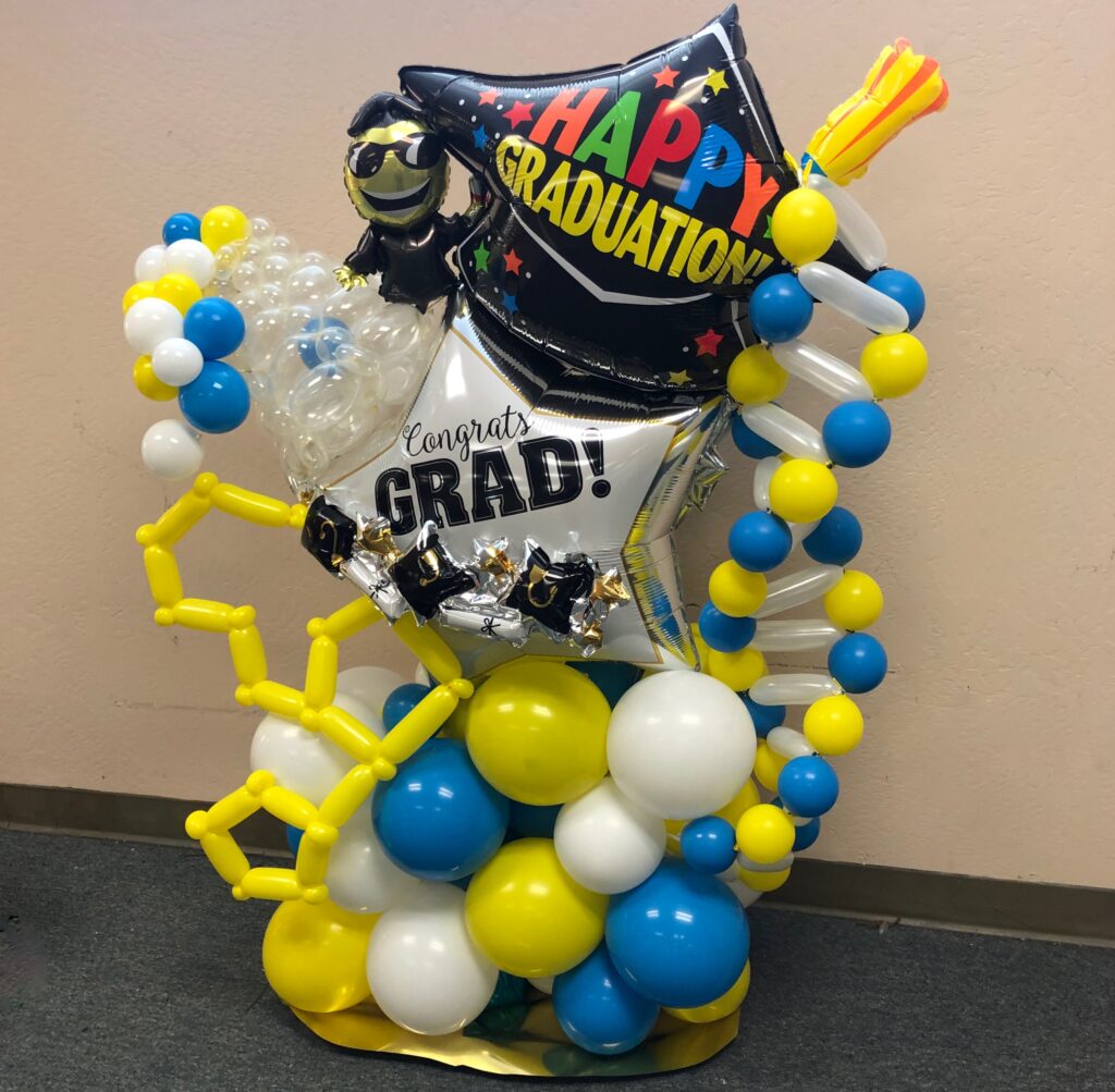 Full Organic Number Arch $600Gold Grad Party Posts $150 eachGolden Grad Garland $350Double Bubble Star Spray $125 + Puffball Centerpieces $35 eachPurple Grad Party Posts $150 eachPurple + White Grad CelebrationCool Grad Bouquets $95 eachHappy Bday Graduate Bunch $100Standard Graduation Bouquets $85 eachDouble Grad Celebration Arch with Number $450Grad Pillar Entrance with Name Classic Walk Through Arch $350Deluxe Graduation Arch $165Puffball Grad CenterpieceCongrats Grad PostsGrad Number Set Freestanding $350RedBig Red Numbers with Big Red Balloons $190Class of Graduation Display $325Tent ClustersCelebration CenterpieceMulti Grad Name CelebrationBlue + Yellow Grad Party Posts $150 eachBiotech Grad Display $175Smiley Grad ManBig Smiley Face GraduatesSmiley Grad ColumnPromotion Grad Sculpture $275Female Grad Character Sculpture $325Grad Character SculptureCongrats Grad 40″ HoopRed Carpet Grad ColumnsPatio Cluster with Low Grad CenterpieceShoot for the Stars ColumnOh, The Places You’ll Go!Deluxe Jumbo Arch with Number & DancefloorHappy Grad Pool FloatTable Top Grad BouquetsBig Congrats Grad Bouquet