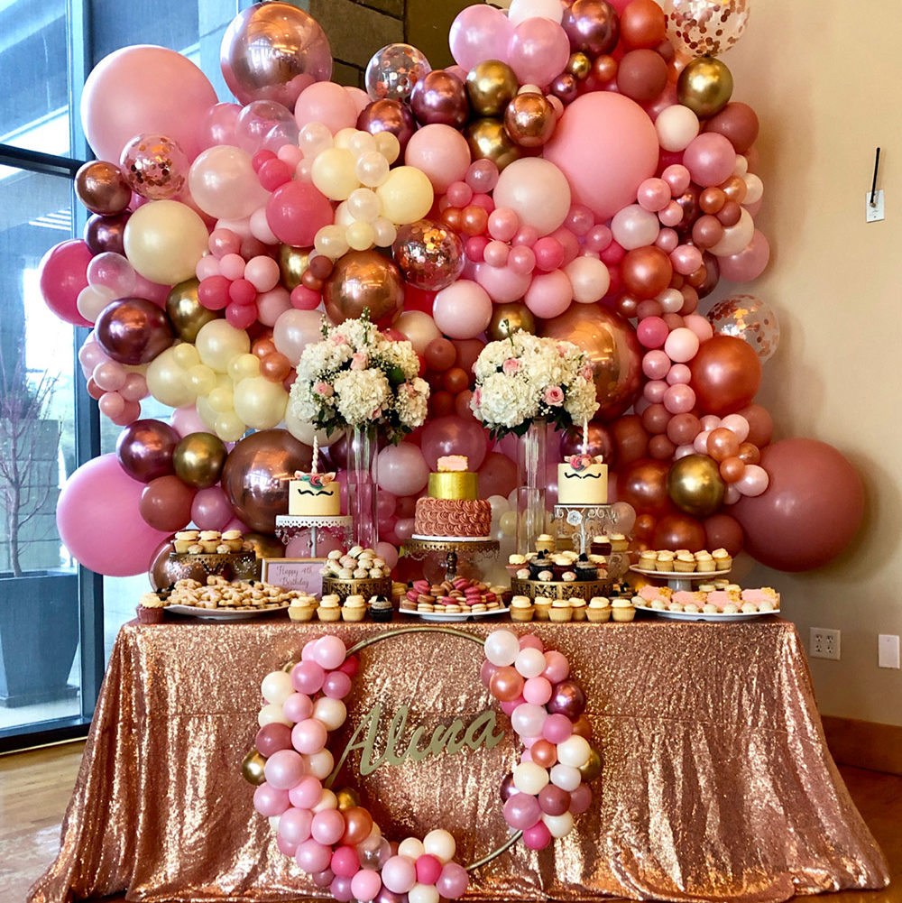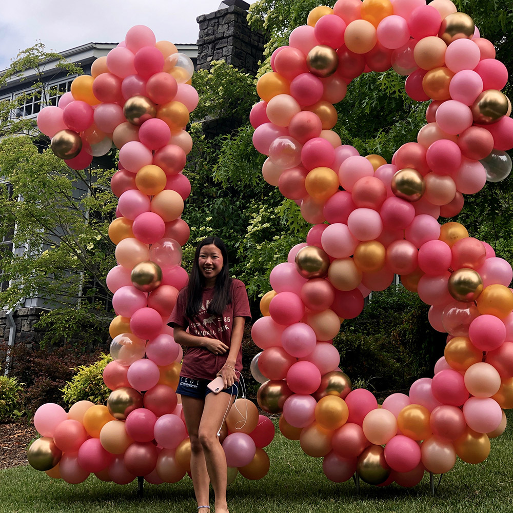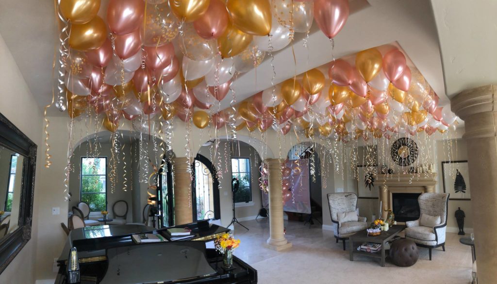 We offer balloon installations where we set up the balloons on location in a pool, on the ceiling, as backdrop or more. Our professionals practice Covid-19 protocols including wearing a mask while respecting personal space. See more installations in our gallery.